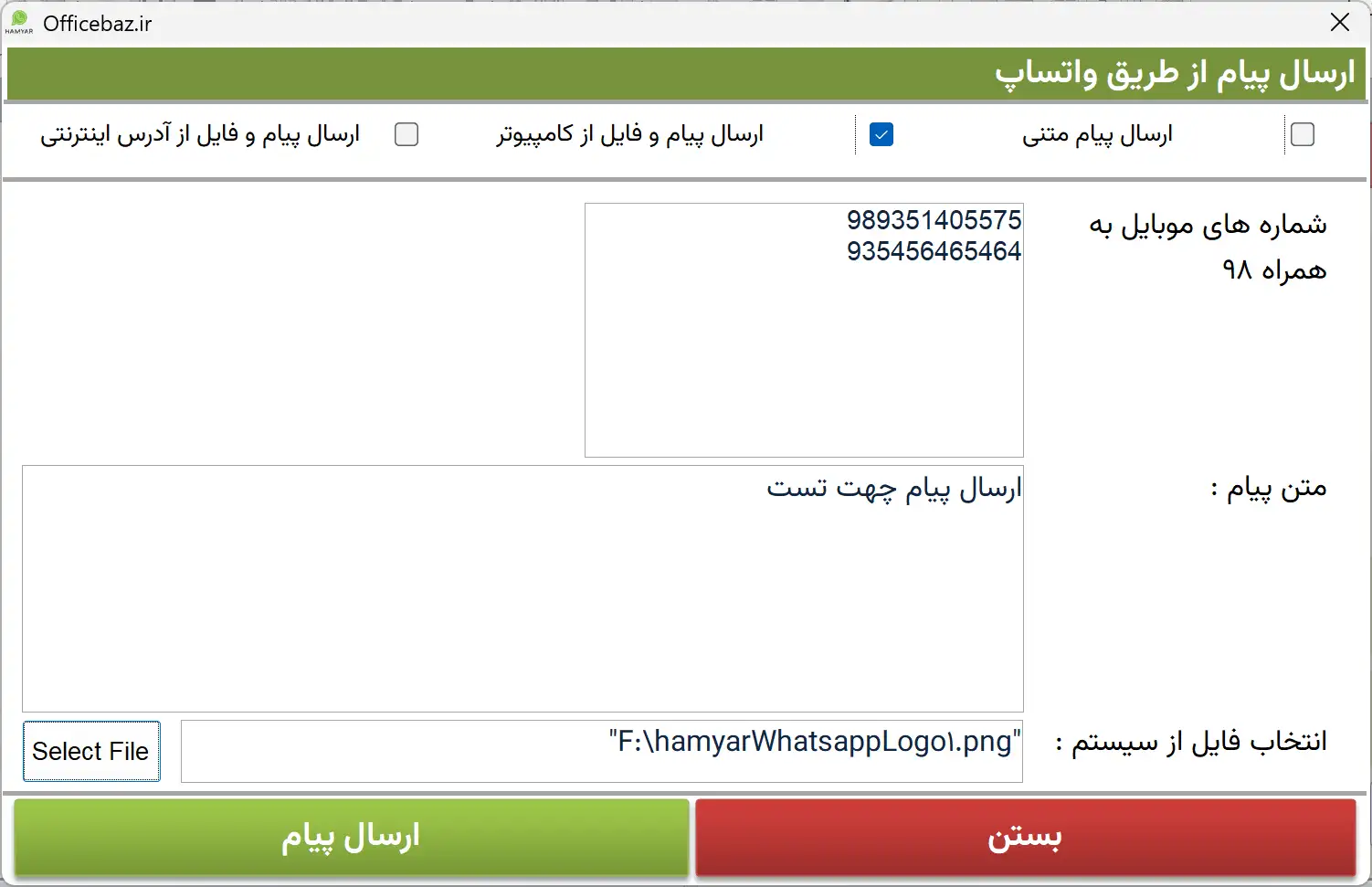 - برای هر فرد می توانید پیام مخصوص به اون و فایل مربوطه ارسال کنید
